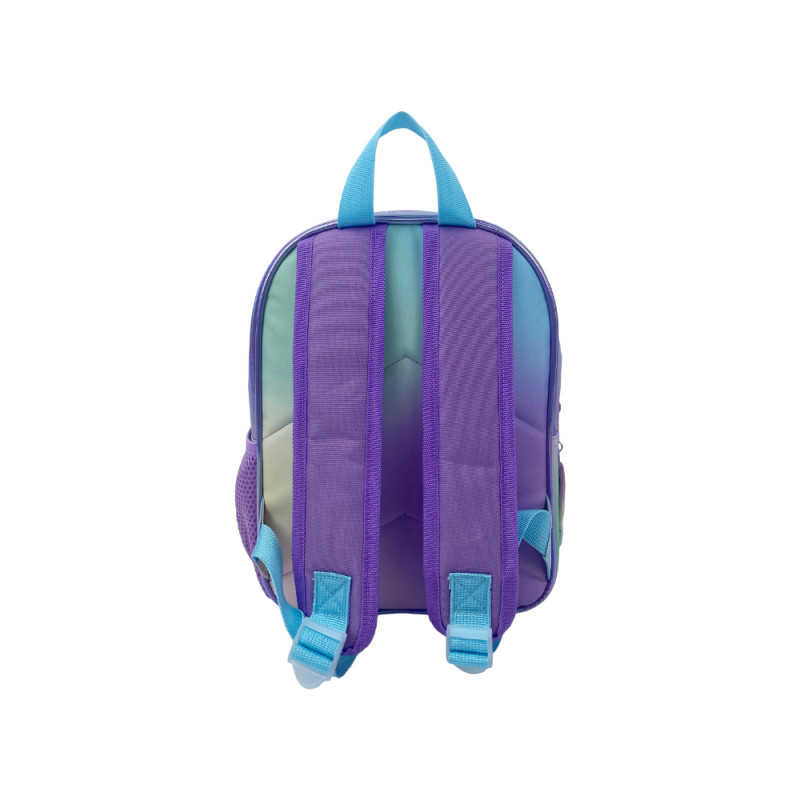 Mochila de Gabbys Dollhouse. El color principal es el morado. Se cierra con cremalleras. Tiene dos asas acolchadas y regulables para llevar en la espalda y un asa en la parte superior. Un bolsillo exterior con cremallera. Tiene un motivo estampado sobre la superficie. Tiene un pequeño detalle bordado sobre la superficie. Las medidas aproximadas son 30x26x10 cm. Este producto licenciado es oficial y 100% original.